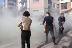 全体师生疏散到楼下广场,在教员们组织下,学习如何使用灭火器,火源点燃后,大家拔掉安全销,按压把手,手持软管对准火源一齐喷射,现场粉尘飞扬,火源被迅速扑灭,大家又掌握了一项实战技能。